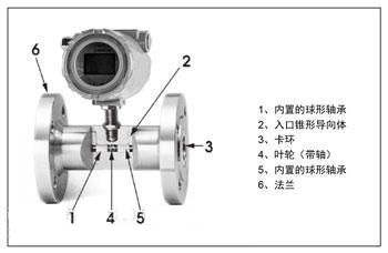 涡轮流量计主要结构:由涡轮和装于外部的检脉冲器构成,液体流进涡轮,引起转子旋转,特定的内径使转子转速直接与流量成比例。检脉冲器将探测到的转子叶片转动转化成与流量成比例的脉冲信号。特定的变量是K因数(脉冲数/升),每个传感器都通过校验确定出K因数并在标牌上注明,如客户要求还可提供校验报告。