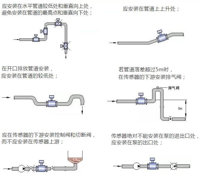 若测量管道有振动,在流量计的两边应有固定的支座测量不同介质的混合液体时混合点与流量计之间的距离最少要有30×D(D为流量计内径)长度为方便今后流量计的清洗和维护,应安装旁通管道;
