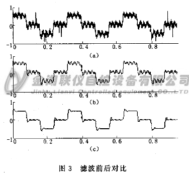 式中:Q是衡量陷波滤波器的窄带带宽的因子,f,是需要滤除的频率,f,是采样频率。通过上述的公式设计谁波器.令Q=4o,fo=50,图3(b)是经高频滤波的带有50Hz工频干扰的三值波信号,图3(c)是带干扰信号通过50Hz滤波器后的图形。图4(b)是三值波信号盛加7 50.5H:的工频干扰,图4(c)是通过50Hz陷波滤波器的波形。从图4可以看出,当工频频率偏离50H:时