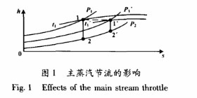 主燕汽节流对汽轮机功率的变化可以用焙摘图,如图一所示进行计算.图一,t':h为结值,,为摘。燕汽连经锅炉出口和汽轮机人口的节流孔板是一个绝热竹流过程,燕汽始值不变;同时根据摘增原理.竹流产生机械能损失造成摘值增加。已知节流前的状态A人及节流后的压力P.,根据节流前后结值相等的特点,可在水热汽的h-s图上确定节流后的各状态参数。如